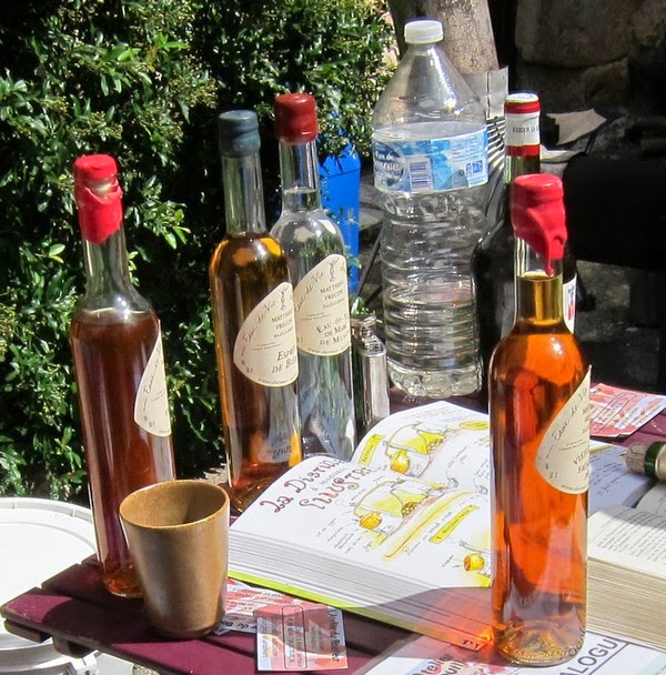 At the Faugères high summer fete this year Matthieu Frécon was demonstrating his still. The stove on the left heats the fermented brew and the boiled off alcohol and other vapours pass along the turquoise towel wrapped pipe to the vessel on the right. Here it condenses in a water cooled coil and the dribble of clear liquid going into the steel bucket is the result.
